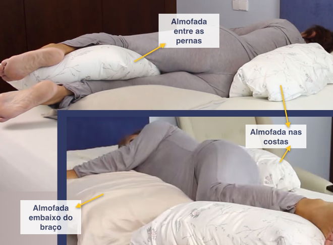 6. Para deixar a pessoa mais confortável, coloque um travesseiro entre as pernas, outro por baixo do braço que está em cima e uma almofada pequena debaixo da perna que está em contato com a cama, acima do tornozelo.