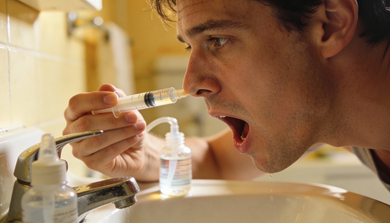 Para fazer corretamente, encha uma seringa com 10 a 20 mL de soro fisiológico estéril, incline o corpo para frente e a cabeça ligeiramente para o lado. Posicione a seringa na entrada de uma narina, pressione até o soro sair pela outra narina, mantendo a boca aberta e respirando por ela. Repita o processo 2 a 3 vezes ao dia.