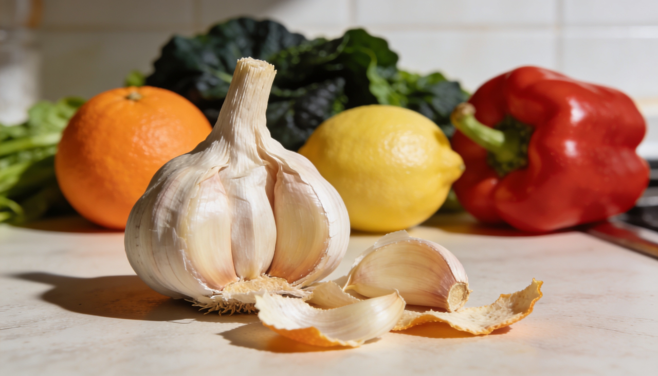 As frutas cítricas como laranja, toranja, limão e acerola superam o alho pela concentração excepcional de vitamina C e antioxidantes. Segundo informações do Ministério da Saúde brasileiro divulgadas em 2017, a vitamina C desempenha papel crucial como antioxidante, estimulando diretamente a produção de glóbulos brancos, células imunológicas essenciais no combate a infecções.