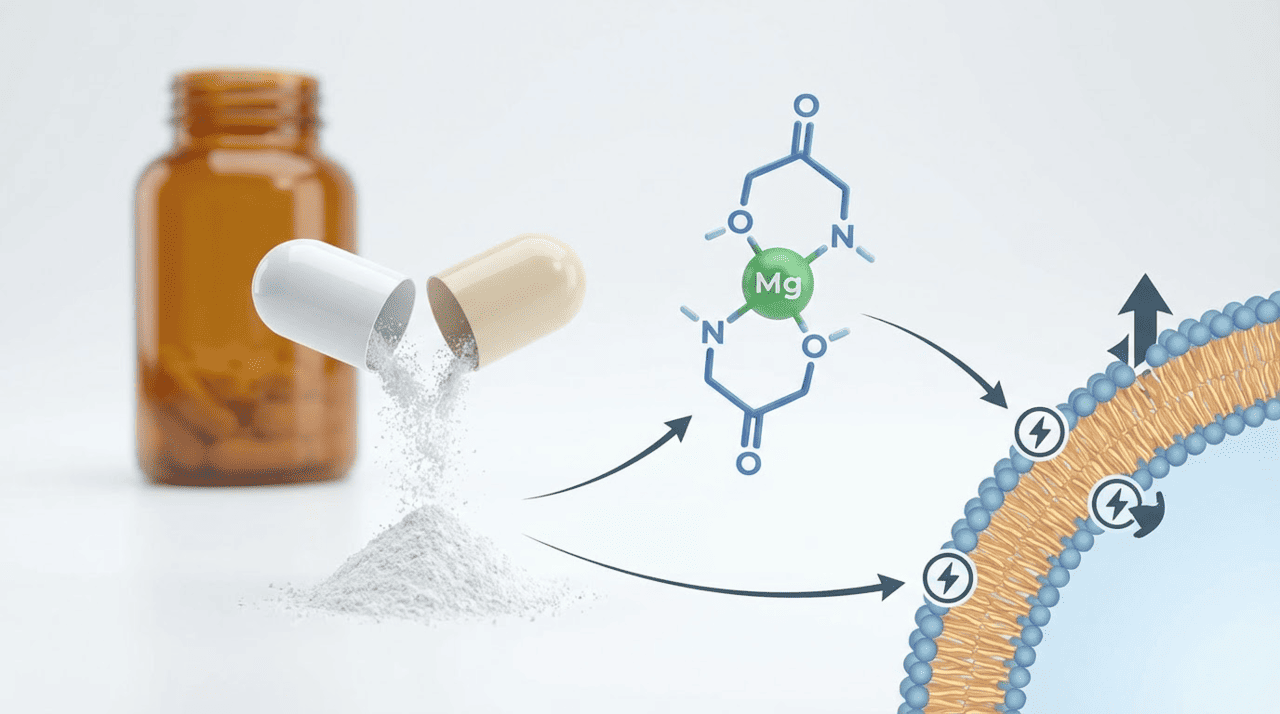 A estrutura quelada do bisglicinato de magnésio oferece vantagens farmacológicas importantes em relação a outras formas de magnésio. A glicina protege o íon magnésio em pH ácido do estômago e facilita sua absorção através de transportadores específicos de peptídeos no intestino delgado, permitindo que parte do composto seja absorvida intacta como dipeptídeo, contornando mecanismos de absorção competitivos.