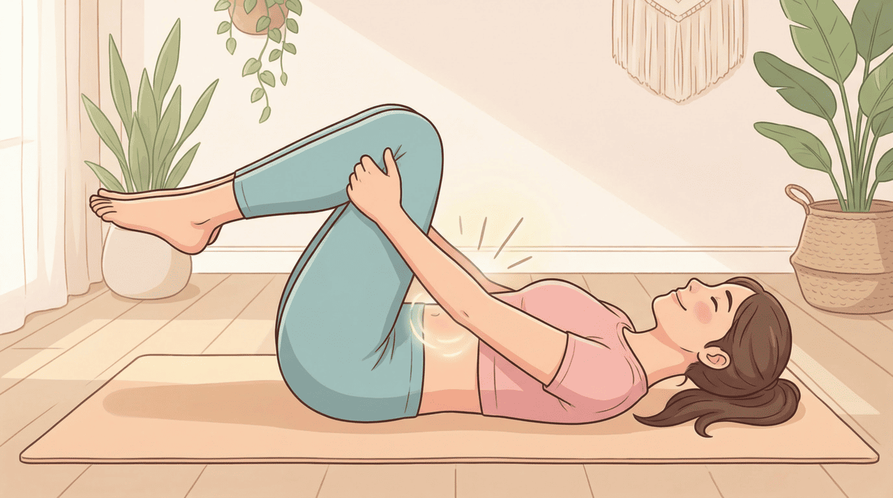 - Torção de tronco: Sentado ou deitado, girar o tronco ajuda a “espremer” o ar para fora das alças intestinais.