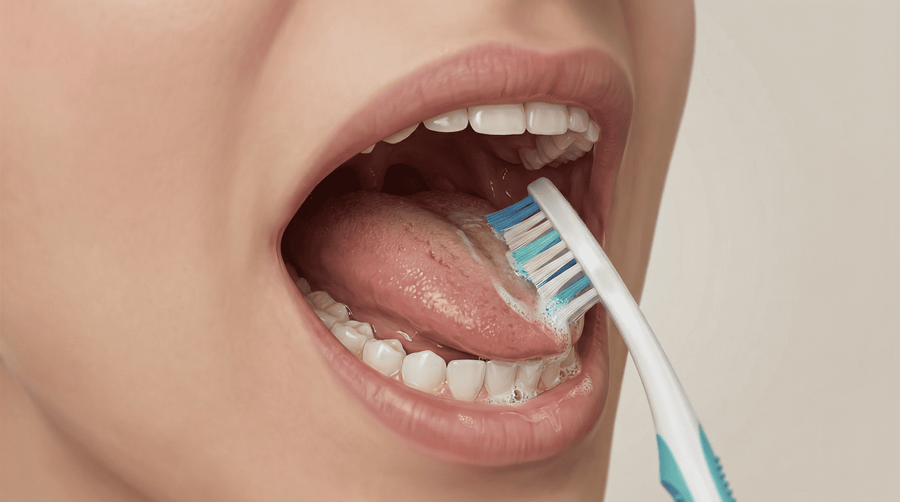 • Limpar a língua com um raspador específico, focando especialmente a parte posterior, onde a saburra lingual se acumula com maior frequência