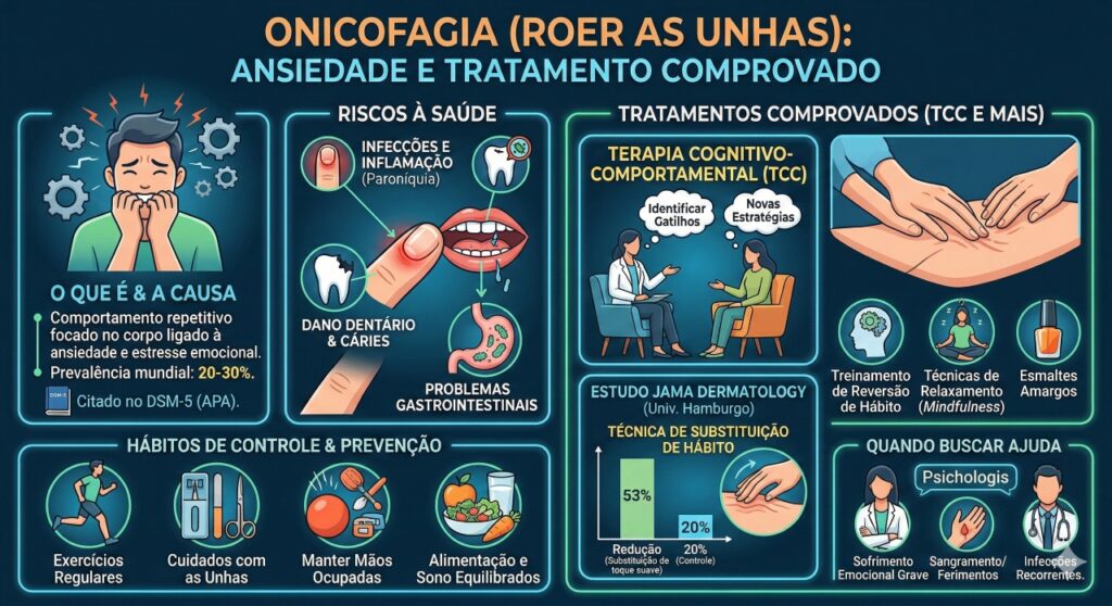 Terapeutas especializados em saúde comportamental apontam a terapia cognitivo-comportamental (TCC) como o tratamento mais eficaz para combater a onicofagia. Essa abordagem psicoterapêutica ajuda o paciente a identificar os gatilhos emocionais que desencadeiam o impulso de roer as unhas e a desenvolver estratégias de enfrentamento mais saudáveis.