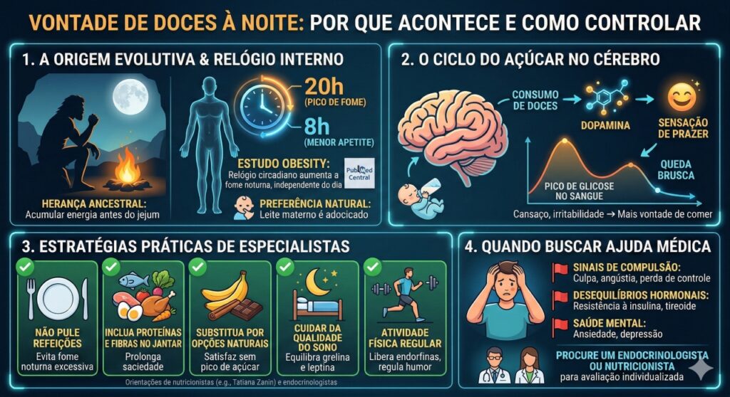 O desejo intenso por alimentos doces no período da noite não é um capricho. Trata-se de uma herança dos nossos antepassados, que precisavam ingerir alimentos ricos em energia antes de longos períodos sem comer. O sabor doce funcionava como um sinal positivo de segurança alimentar, indicando que o alimento era seguro para consumo. Essa preferência pelo doce começa desde o nascimento, já que o leite materno possui um sabor naturalmente adocicado.