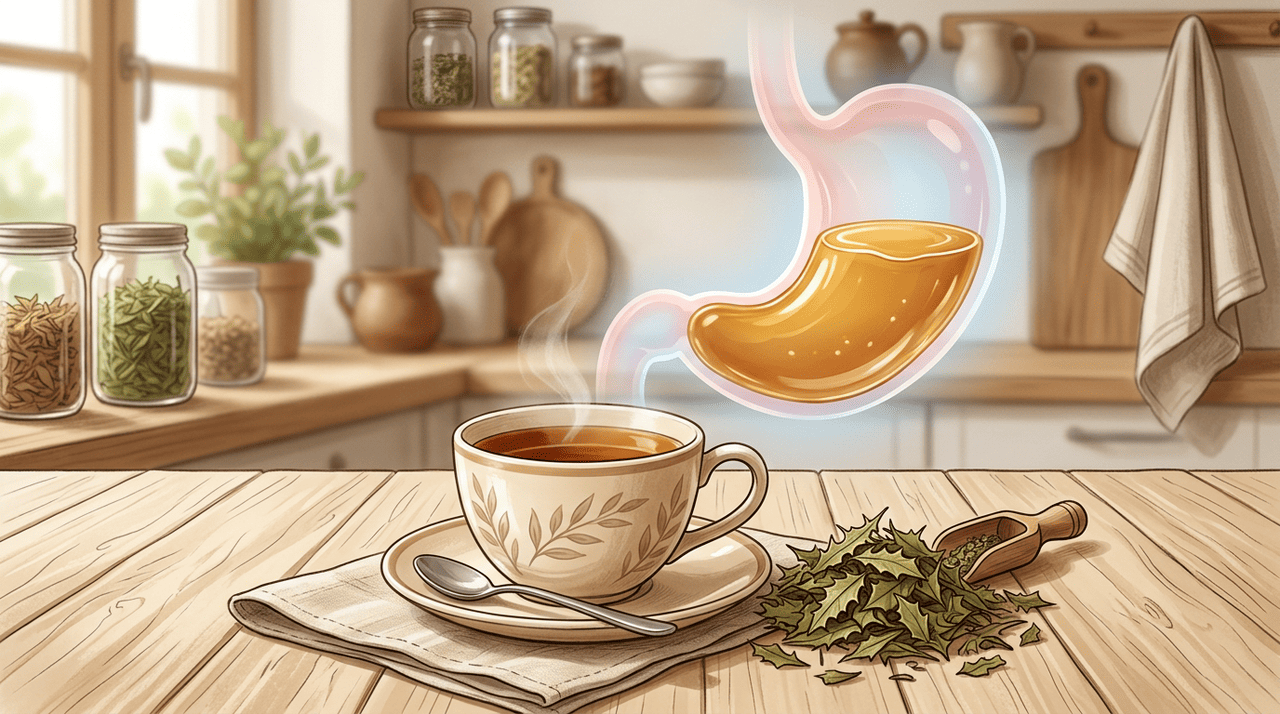A espinheira-santa é uma das plantas medicinais mais tradicionais do Brasil para o alívio de problemas gástricos. Suas folhas contêm compostos como flavonoides e taninos que atuam diretamente na proteção da mucosa do estômago, reduzindo a acidez e acalmando a irritação. No entanto, para que o chá exerça todo o seu potencial gastroprotetor, há uma condição importante: o consumo em jejum, antes da primeira refeição do dia, é o que permite à planta agir de forma mais eficaz sobre a parede gástrica.