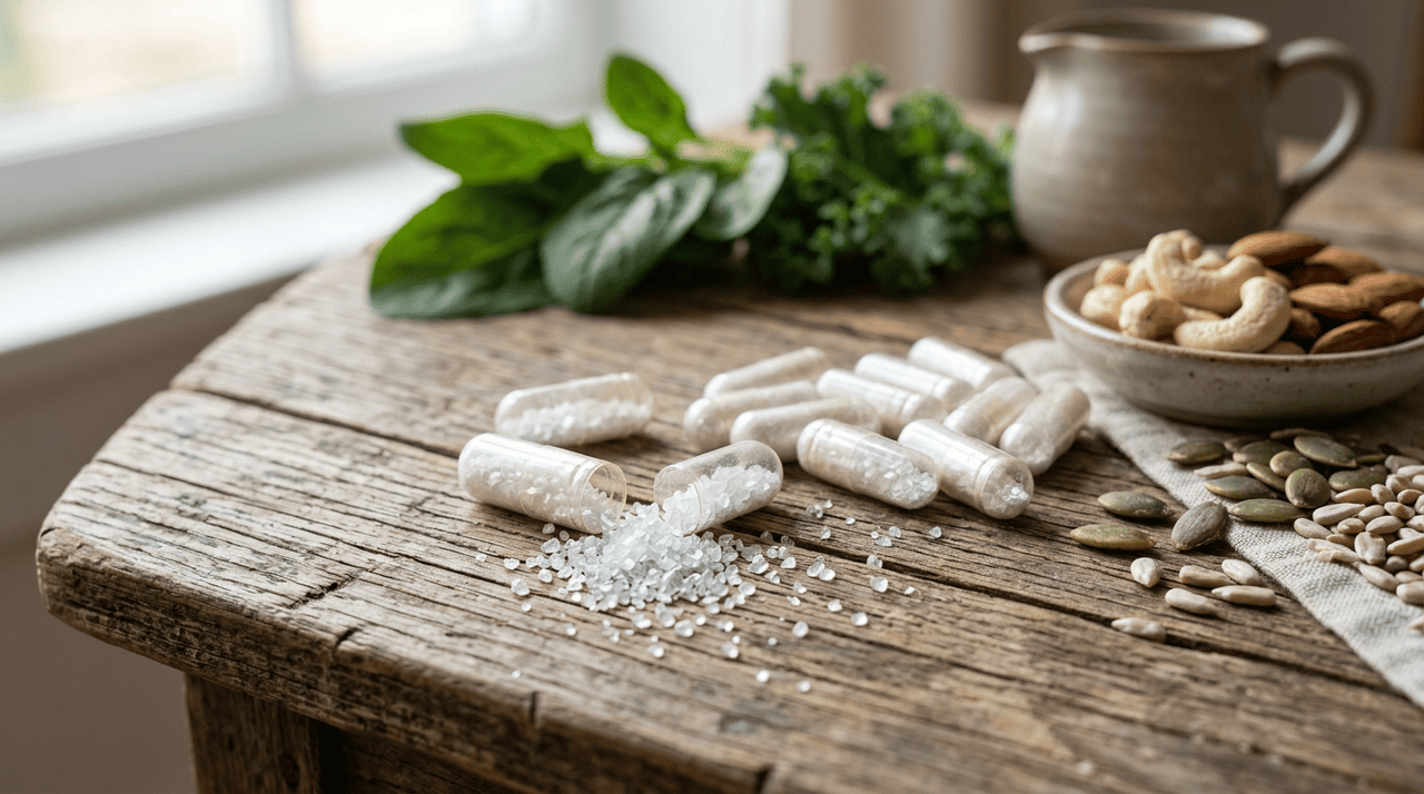 O magnésio é um mineral que o corpo não produz sozinho e que precisa ser obtido pela alimentação ou por suplementos. Ele atua diretamente na contração e no relaxamento dos músculos, na regulação do açúcar no sangue, na produção de energia celular e na formação dos ossos. Também influencia a produção de substâncias que regulam o sono e o humor.