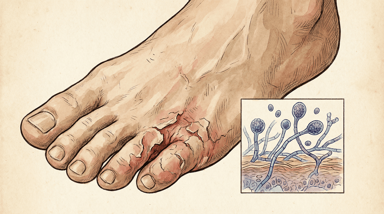 A frieira é uma infecção causada por fungos que se desenvolvem em ambientes quentes e úmidos, provocando coceira, descamação e mau cheiro nos pés.