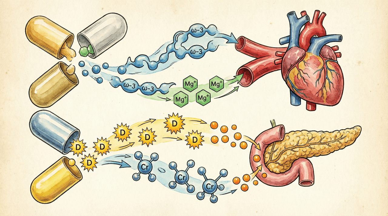 Alguns suplementos têm mostrado potencial para auxiliar na prevenção do diabetes tipo 2 e de doenças cardiovasculares, especialmente quando combinados a uma alimentação equilibrada e à prática regular de exercícios físicos. Entre os mais estudados pela ciência estão o ômega-3, o magnésio, a vitamina D e o cromo — nutrientes que atuam no controle da glicose, na redução da inflamação e na proteção do coração. Entender como cada um funciona pode ajudar você a fazer escolhas mais conscientes para a sua saúde.