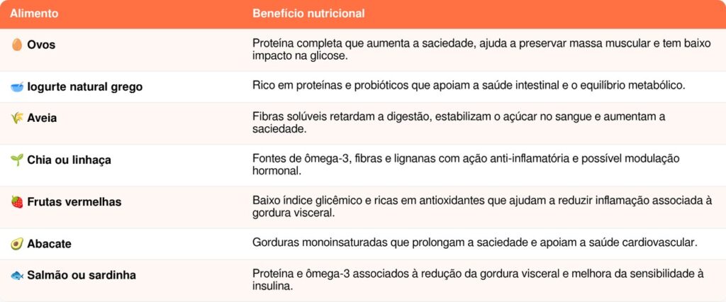 Não existe um alimento milagroso isolado, mas há combinações que atuam de forma complementar sobre o metabolismo, a saciedade e o controle da gordura abdominal. Os sete alimentos a seguir reúnem as propriedades mais relevantes para essa fase: