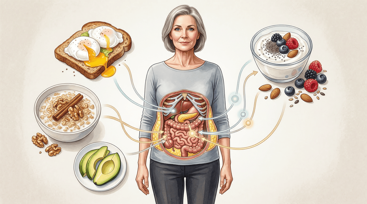 Após a menopausa, o metabolismo basal, a quantidade de energia que o organismo consome em repouso, pode reduzir em até 250 a 300 calorias por dia. Sem ajustes na alimentação, esse processo contribui para o ganho gradual de peso, especialmente na região do abdômen. Uma refeição matinal equilibrada, rica em proteínas e fibras, ajuda a estabilizar o açúcar no sangue desde o início do dia, reduz os picos de insulina e diminui a fome nas horas seguintes.