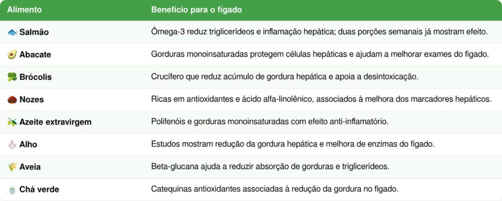 A relação entre escolhas alimentares e gordura no fígado está bem documentada. Segundo a revisão científica Peixes gordos, café e nozes: tratamento dietético para a doença hepática gordurosa não alcoólica, publicada no World Journal of Gastroenterology e indexada no PubMed em 2015, peixes oleosos, nozes, abacate e azeite de oliva demonstraram, em ensaios clínicos com humanos, capacidade de reduzir o acúmulo de gordura no fígado, melhorar os marcadores de função hepática e modular a inflamação, de forma independente da perda de peso. Os autores concluem que esses alimentos podem ser indicados como complemento às recomendações de atividade física e restrição calórica em pacientes com a condição.