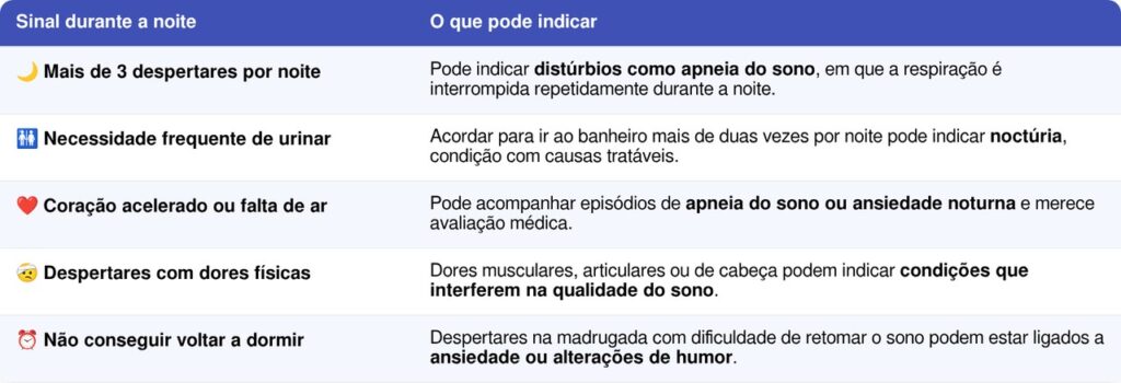 Há diferenças importantes entre despertares fisiológicos que fazem parte do funcionamento natural do sono e despertares que sinalizam alguma condição subjacente que merece investigação. Os principais sinais de alerta incluem: