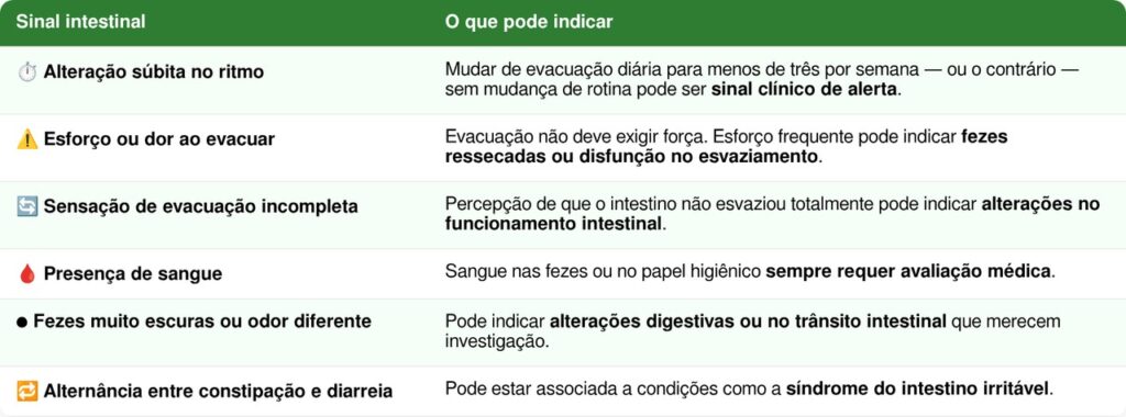 Mais do que o número de evacuações, são as mudanças bruscas no padrão habitual e os sintomas associados que devem acender o alerta. Os principais sinais que merecem atenção incluem: