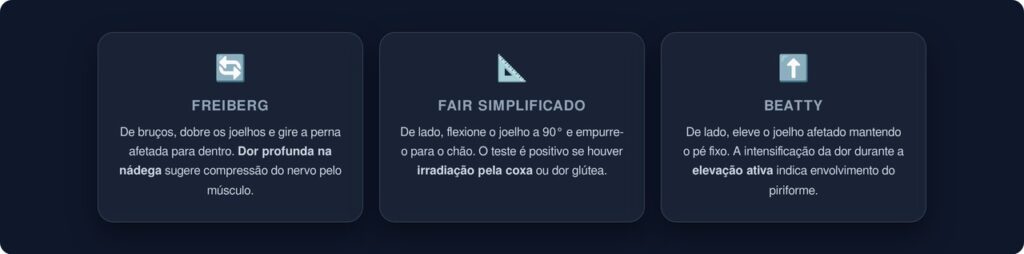 • Teste de Beatty: deite de lado sobre a perna saudável, com a perna afetada por cima. Eleve o joelho de cima alguns centímetros sem mover o pé. Se a dor glútea surgir ou se intensificar com esse movimento de elevação, o teste sugere envolvimento do músculo piriforme.
