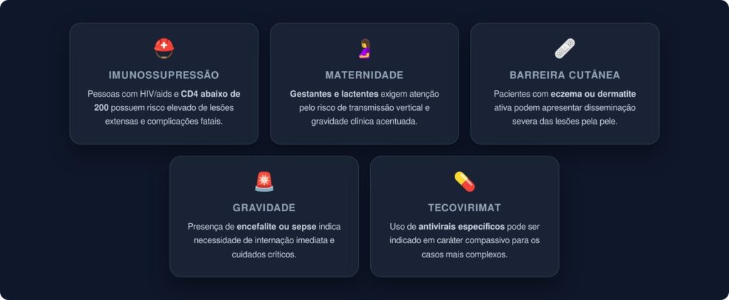 Embora a maioria dos pacientes se recupere sem complicações, alguns grupos apresentam risco maior de desenvolver formas graves da doença e podem precisar de cuidados adicionais, incluindo hospitalização e o uso de antivirais como o tecovirimat em caráter compassivo. Os grupos que merecem atenção especial incluem: