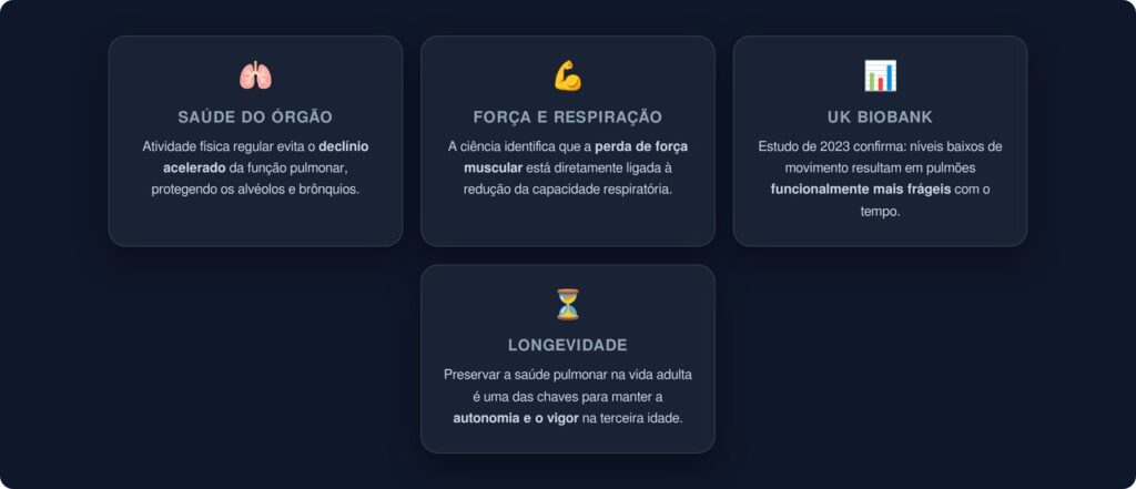 A relação entre atividade física e função pulmonar vai muito além do condicionamento físico. Um estudo de coorte com dados do UK Biobank, publicado em 2023 na revista Respiratory Medicine, acompanhou milhares de adultos e mostrou que níveis mais baixos de atividade física estavam associados a um declínio mais acelerado da função pulmonar ao longo do tempo. Os pesquisadores também identificaram uma forte ligação entre perda de força muscular e piora na capacidade respiratória. Segundo o estudo The longitudinal association between physical activity, strength and fitness, and lung function, publicado na Respiratory Medicine em 2023, manter-se ativo regularmente é uma das formas mais eficazes de preservar a saúde dos pulmões na vida adulta — especialmente à medida que a idade avança.