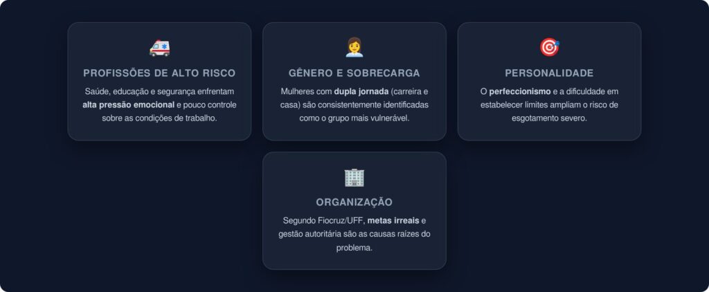 Embora qualquer trabalhador possa desenvolver burnout, alguns grupos apresentam risco mais elevado. Profissionais de saúde, educação, segurança pública e atendimento ao cliente estão entre os mais afetados — áreas marcadas por alta pressão emocional, cobrança por resultados e pouco controle sobre as condições de trabalho. Mulheres com dupla jornada — que conciliam carreira, maternidade e responsabilidades domésticas — aparecem de forma consistente nos dados como o grupo mais vulnerável. Características individuais como perfeccionismo, dificuldade em estabelecer limites e tendência à autocobrança excessiva também ampliam o risco. No fundo, porém, especialistas da Fiocruz e da UFF são enfáticos: o problema não está no trabalhador, mas nas condições e na organização do trabalho — metas irreais, gestão autoritária e ausência de participação nos processos decisórios são os principais fatores estruturais.