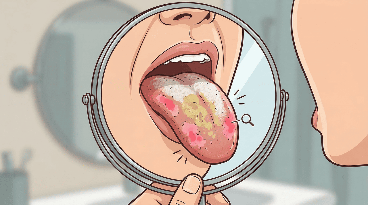 Pode indicar candidíase oral, desidratação, alterações digestivas ou uso prolongado de antibióticos.