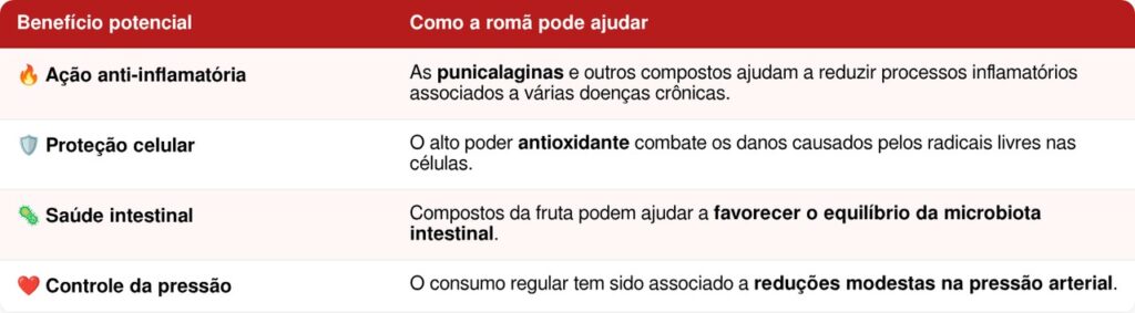 A proteção cardiovascular é o efeito mais estudado do romã, mas seus compostos também oferecem vantagens adicionais para o organismo. Entre os benefícios associados ao consumo regular dessa fruta estão: