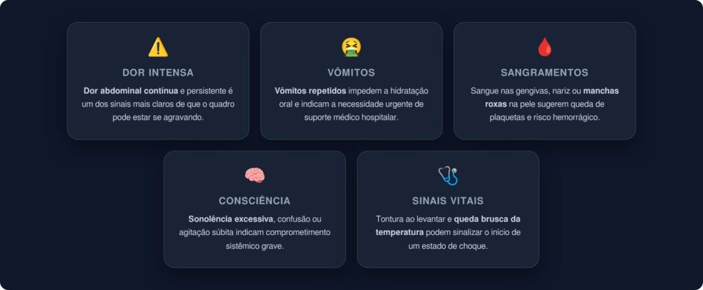 Entre o terceiro e o sétimo dia da doença, quando a febre começa a ceder, é que os riscos aumentam. Esse é o período mais perigoso, porque os sinais de agravamento podem surgir justamente quando a pessoa acredita estar melhorando. Qualquer um dos sinais abaixo deve levar imediatamente a uma unidade de saúde: