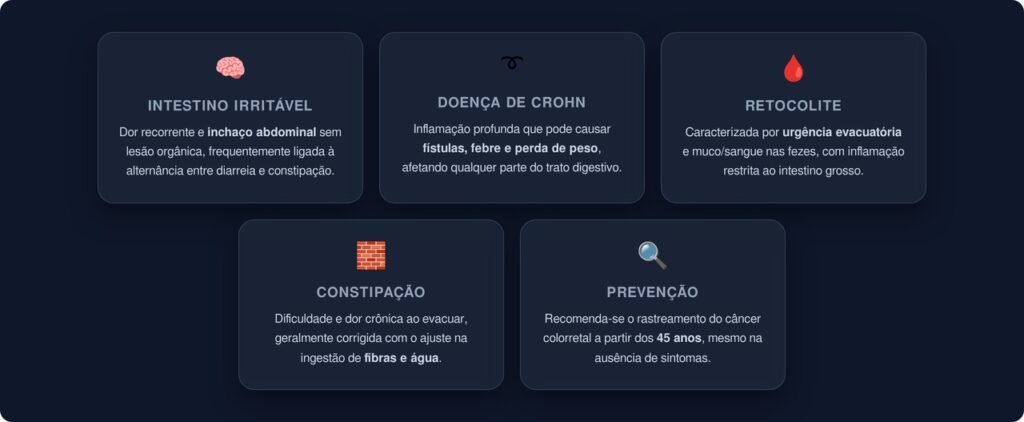 - Retocolite Ulcerativa: sangramento retal, cólicas, muco nas fezes e urgência para evacuar — inflamação restrita ao intestino grosso e ao reto
