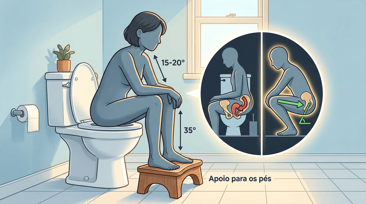 Na posição agachada, esse ângulo se abre naturalmente, permitindo que o canal retal fique mais reto e as fezes passem com muito menos esforço. Como a maioria das pessoas utiliza vasos sanitários convencionais, a solução mais prática é simular essa posição usando um apoio para os pés.