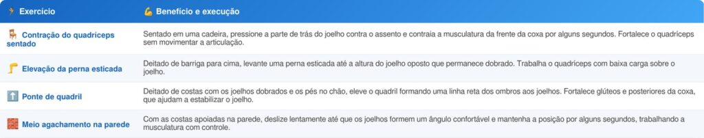 Para quem sente desconforto ao se exercitar, os exercícios isométricos são o ponto de partida mais seguro. Neles, o músculo é ativado sem que haja movimento da articulação, o que reduz significativamente o estresse sobre o joelho. Com o tempo, é possível avançar para movimentos mais amplos. Alguns dos mais indicados para começar incluem:
