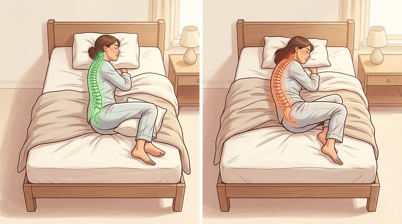• Posição lateral com travesseiro entre os joelhos — é a preferida pela maioria das pessoas com dor lombar crônica e ajuda a manter a pelve alinhada, reduzindo a torção da coluna.