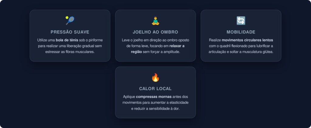 Segundo a revisão sistemática “Diagnosis and Management of Piriformis Syndrome: An Osteopathic Approach”, publicada no Journal of the American Osteopathic Association, o tratamento conservador da síndrome do piriforme deve priorizar técnicas de liberação miofascial e alongamentos suaves e progressivos. O estudo destaca que alongamentos agressivos na fase inicial podem perpetuar o ciclo de dor e espasmo muscular, recomendando abordagens graduais que respeitem os limites do paciente.