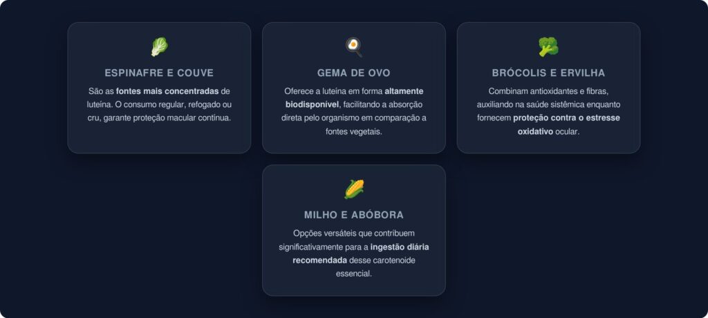 Para especialistas em nutrição, o almoço representa o momento ideal para incluir fontes de luteína na alimentação. Saladas com folhas verde escuras regadas com azeite de oliva ou pratos que combinem ovos com vegetais são exemplos de combinações que favorecem a absorção desse carotenoide. Consumir a luteína em jejum ou em refeições muito leves e sem gordura reduz consideravelmente sua eficácia.