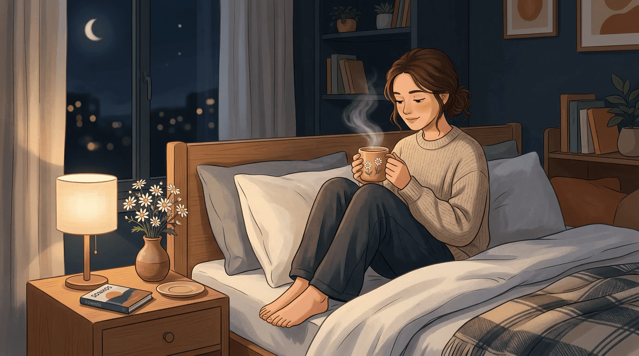 A camomila é uma das plantas medicinais mais utilizadas no mundo para favorecer o relaxamento e facilitar o início do sono. Ela contém apigenina, um composto natural que atua no cérebro promovendo uma sensação de calma, especialmente útil para quem chega ao fim do dia com a mente acelerada. Seu efeito não é sedativo como o de um medicamento, mas funciona como um facilitador suave que prepara o corpo para dormir de forma mais natural.