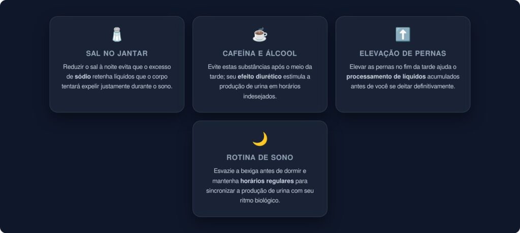 - Manter horários regulares de sono, pois a regularidade ajuda o corpo a ajustar a produção de urina ao ciclo circadiano