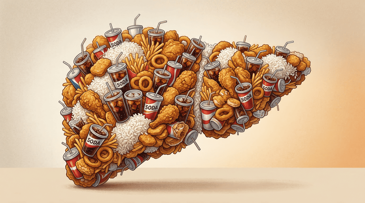 O fígado é responsável por mais de 500 funções no organismo, incluindo a metabolização de gorduras e açúcares. Quando a alimentação sobrecarrega esse órgão de forma contínua, ele começa a armazenar gordura em suas próprias células. O processo acontece gradualmente e, como o fígado não possui terminações nervosas que provocam dor, a pessoa não sente nada até que a situação se agrave. A gordura acumulada pode evoluir para inflamação, fibrose e, em casos mais sérios, cirrose ou câncer hepático.