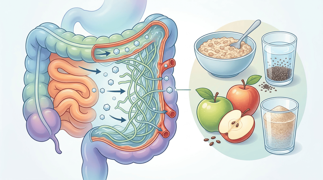 Diferente da fibra insolúvel, que tem papel principal no funcionamento intestinal, a fibra solúvel se dissolve em água e forma um gel viscoso durante a digestão. Esse gel cria uma barreira natural no intestino que torna a absorção dos nutrientes mais lenta, incluindo os açúcares presentes na refeição. O resultado é uma liberação gradual de glicose para o sangue, sem os picos abruptos que sobrecarregam o organismo.