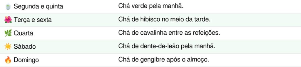 Para aproveitar os benefícios sem exageros, uma boa estratégia é distribuir os cinco chás ao longo dos dias da semana. Veja uma sugestão prática de organização: