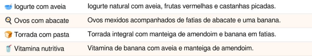 Essas opções são rápidas de preparar e fornecem os nutrientes necessários para começar o dia com disposição. Caso você tenha alguma restrição alimentar, condição de saúde específica ou queira montar um plano alimentar personalizado, o ideal é procurar um nutricionista para receber orientação adequada às suas necessidades.