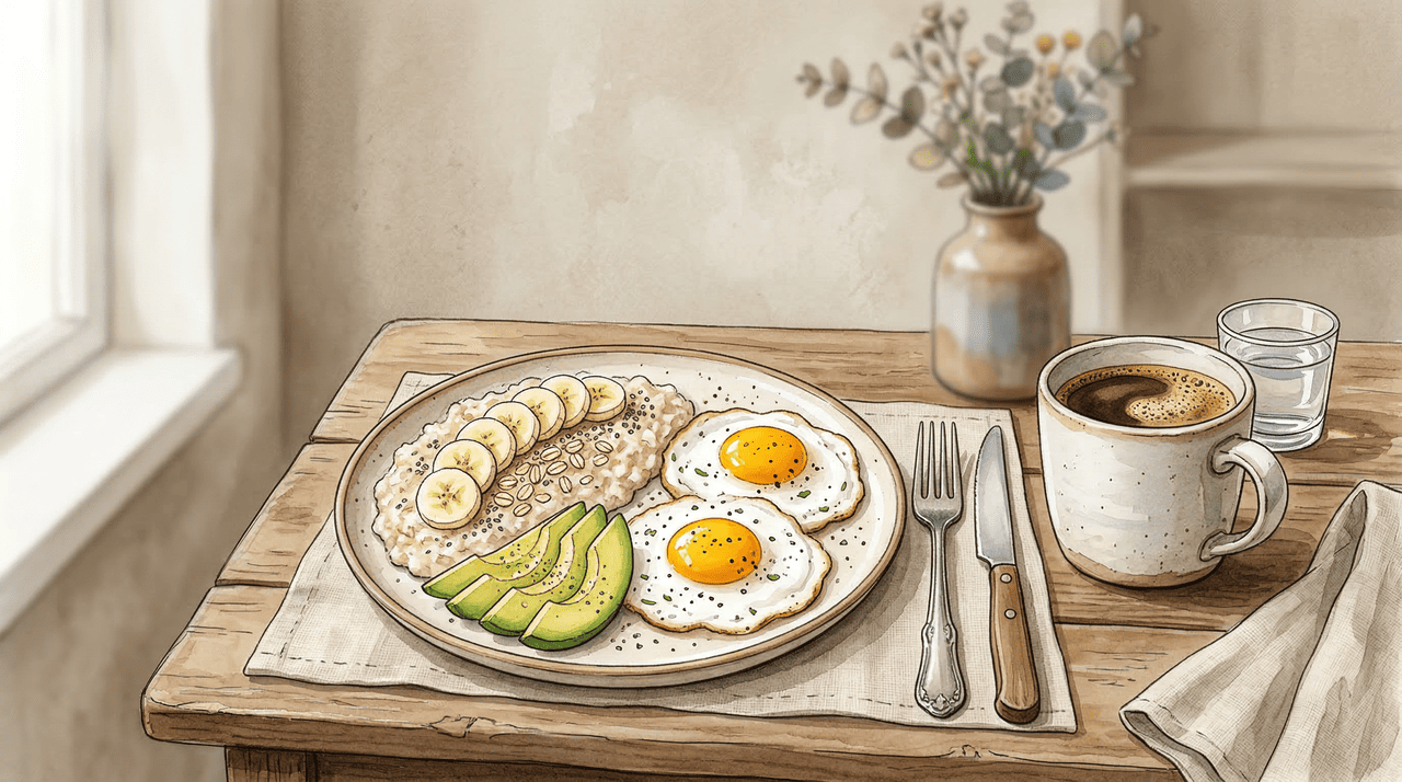 Um café da manhã equilibrado com proteínas, fibras e gorduras saudáveis ajuda a manter a energia estável ao longo da manhã.
