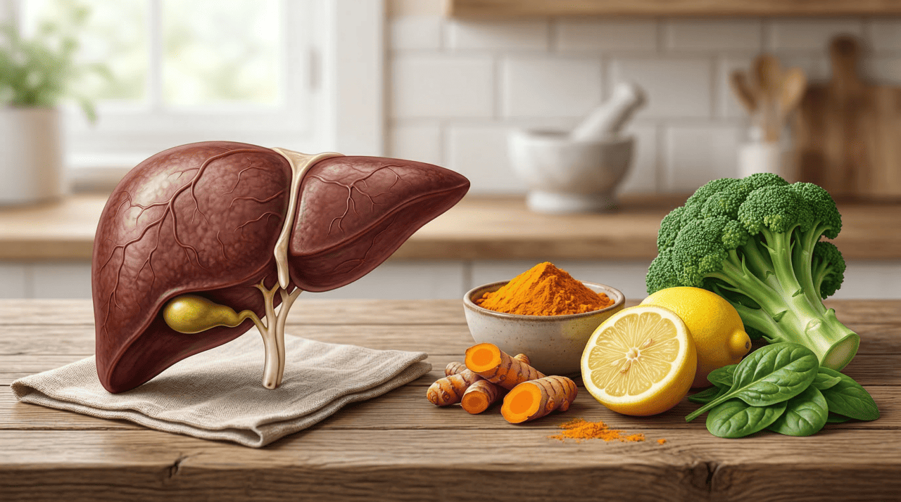 Alimentos como cúrcuma, brócolis, alcachofra e integrais ajudam a apoiar as funções naturais do fígado.