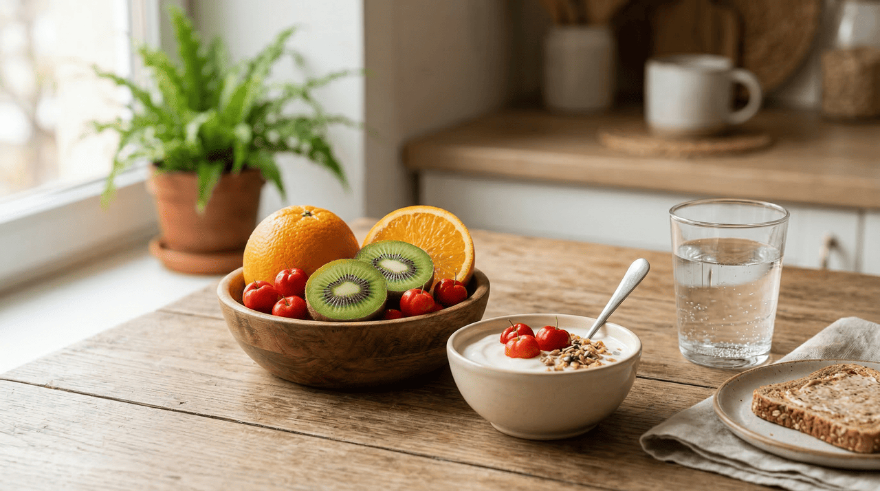 Consuma diariamente frutas como acerola, goiaba ou laranja para apoiar as defesas naturais do organismo.