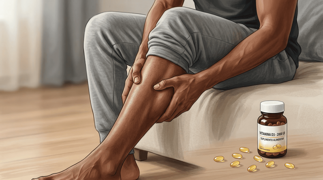 A vitamina D é fundamental para que o corpo absorva o cálcio de forma eficiente. Quando seus níveis estão baixos, a absorção de cálcio é prejudicada, e os músculos perdem a capacidade de contrair e relaxar adequadamente. Isso gera dores difusas, fraqueza muscular, cãibras e uma sensação de fadiga que não melhora com o repouso. A vitamina D também age diretamente nas fibras musculares, participando de processos que mantêm sua força e sua capacidade de recuperação.