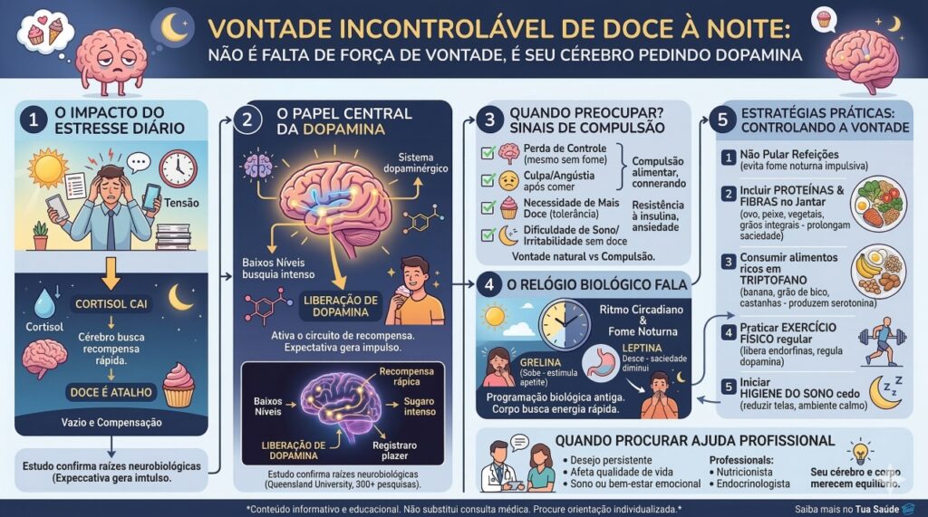 Esse processo explica por que a vontade de comer doce costuma ser mais intensa justamente no período noturno, especialmente em dias de maior pressão emocional. Não se trata de fraqueza pessoal, mas de uma resposta biológica que o corpo desenvolveu para lidar com o desgaste acumulado.