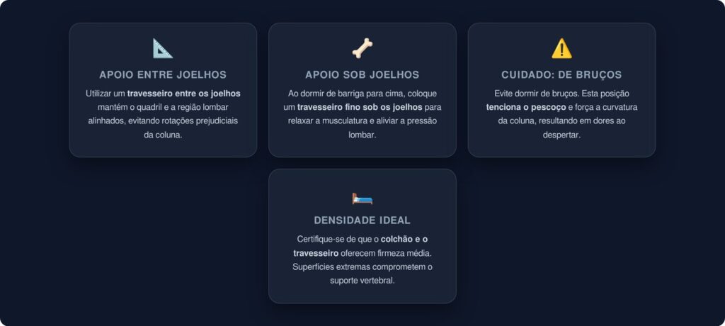 • Escolha colchão e travesseiro adequados: superfícies muito macias ou muito duras podem comprometer o alinhamento vertebral