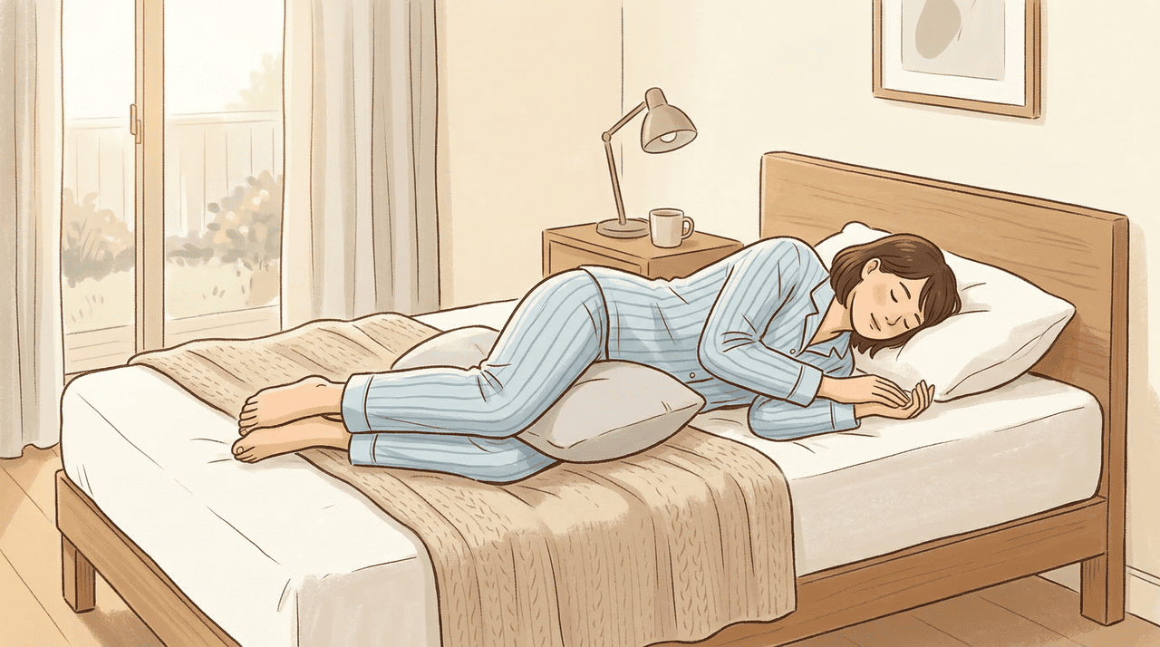 A posição lateral é a mais adotada pela maioria das pessoas e pode ser muito benéfica para a saúde da coluna quando executada da forma adequada. Para que funcione bem, é fundamental usar um travesseiro entre os joelhos, pois esse apoio mantém o quadril alinhado e evita a rotação da região lombar durante a noite.