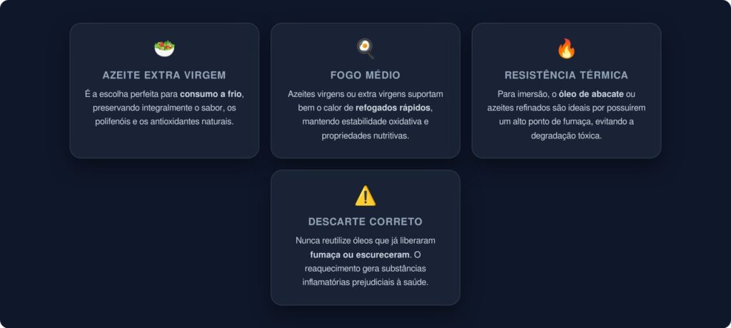 A escolha do óleo ideal depende do método de cocção e da temperatura utilizada. Confira algumas orientações práticas: