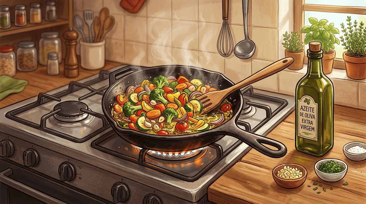 O azeite extra virgem é rico em gorduras monoinsaturadas e compostos antioxidantes, como polifenóis e vitamina E. Quando exposto ao calor moderado, como em refogados e salteados, ele mantém a maior parte de suas propriedades nutricionais. A fumaça que eventualmente aparece não indica necessariamente que o óleo se tornou tóxico, mas sim que alguns compostos minoritários estão se degradando.