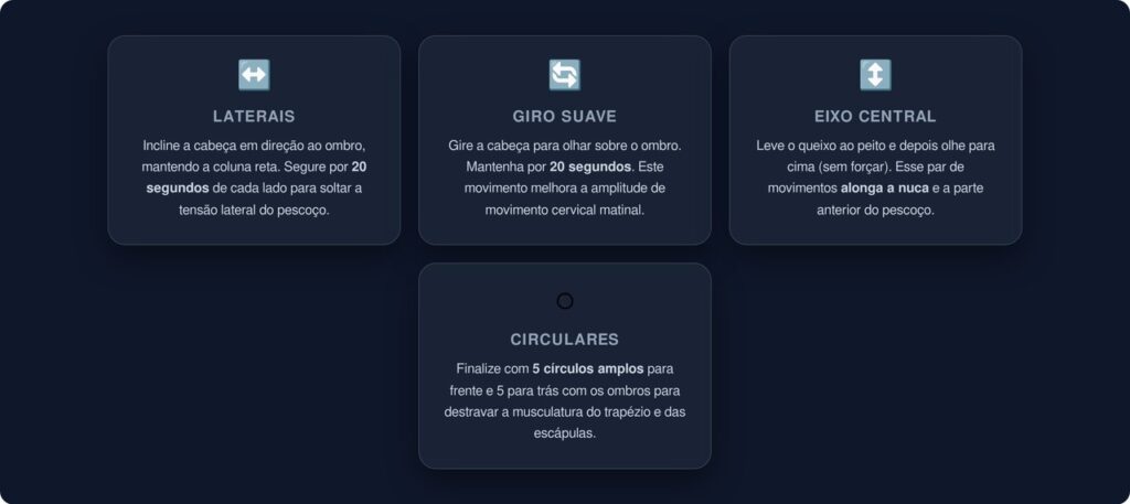 Uma rotina simples de três minutos pode ajudar a soltar a musculatura cervical antes de começar o dia. Realize cada movimento de forma lenta e sem forçar, respirando profundamente durante toda a sequência: