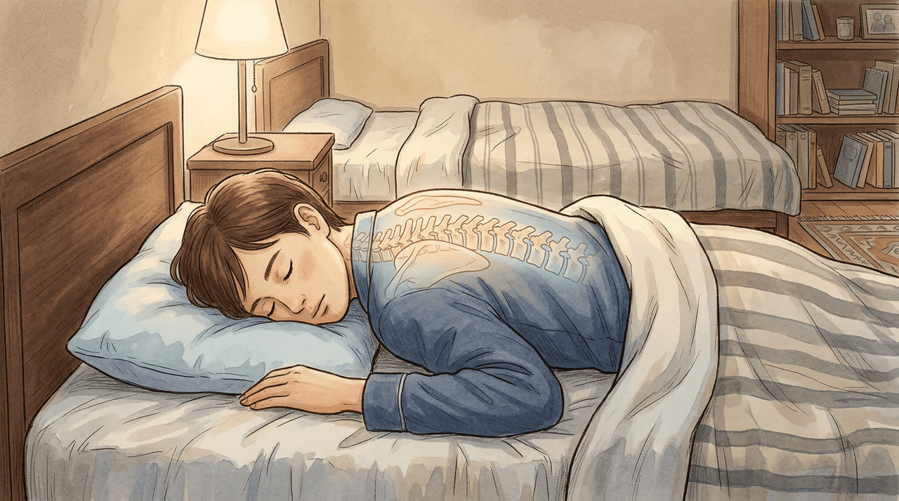 Quando dormimos de barriga para baixo, a coluna cervical fica em rotação extrema de quase 90 graus durante toda a noite. Essa torção constante comprime as vértebras cervicais e mantém a musculatura do pescoço sob tensão prolongada. Ao acordar, os músculos estão encurtados e rígidos, o que limita os movimentos e provoca dor.