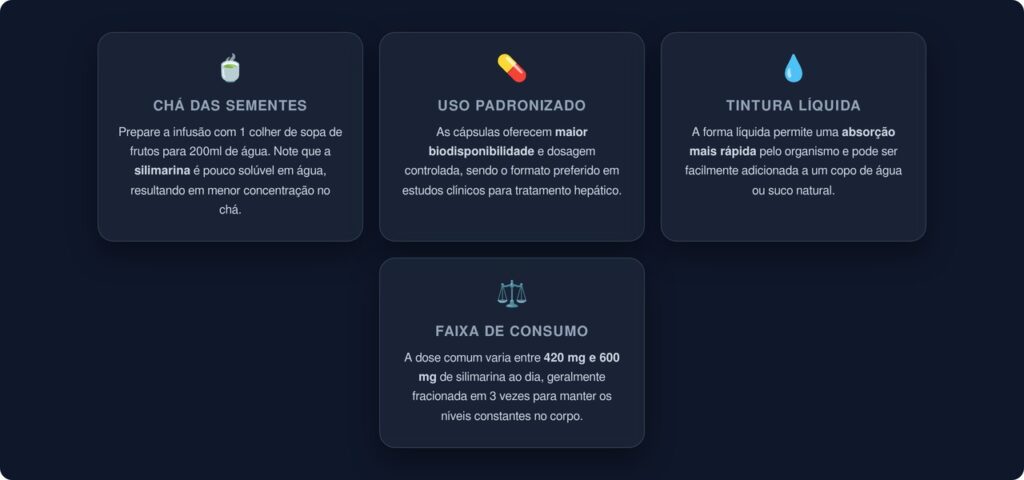 • Chá das sementes: preparar a infusão com uma colher de sopa dos frutos em 200 ml de água quente, abafar por 10 minutos e coar. A silimarina é pouco solúvel em água, então o chá oferece concentração menor do princípio ativo