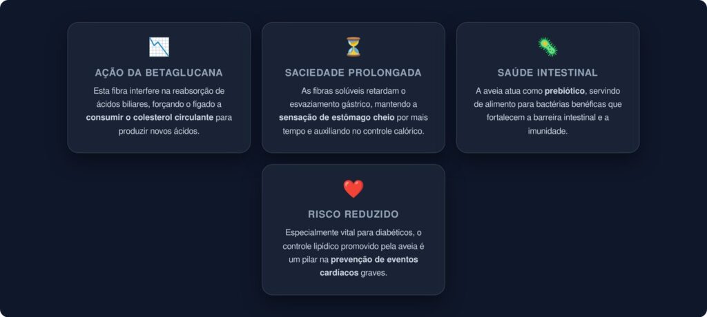 A betaglucana é uma fibra solúvel presente em grande concentração na aveia. Quando entra em contato com a água no trato digestivo, ela forma uma espécie de gel viscoso que retarda o esvaziamento do estômago e diminui a velocidade com que os carboidratos são absorvidos pelo intestino. Com isso, a glicose chega à corrente sanguínea de forma mais lenta e gradual.
