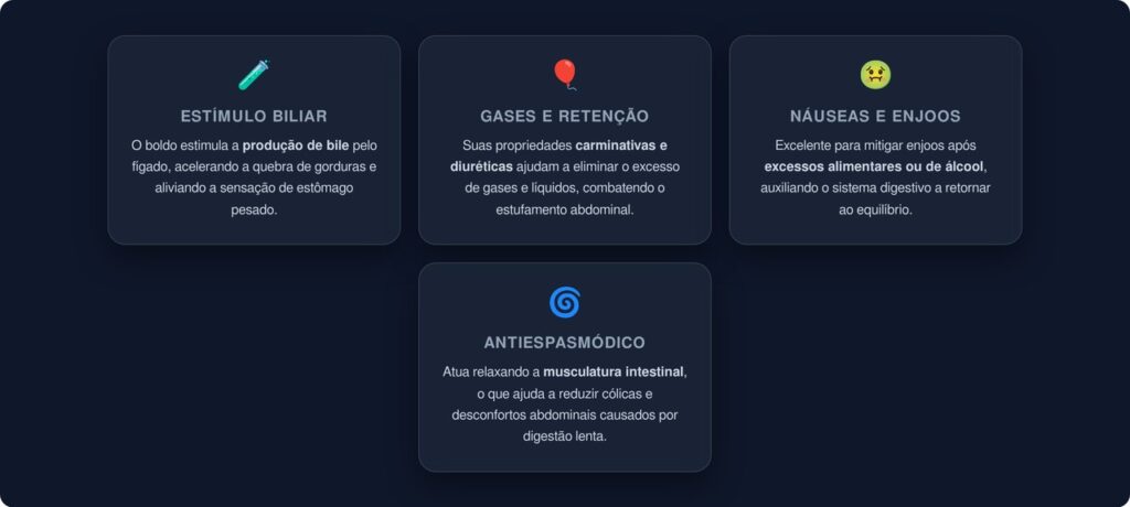Além da ação sobre a bile, o boldo possui propriedades carminativas, ou seja, ajuda a eliminar os gases acumulados no trato digestivo. Esse efeito contribui para reduzir o inchaço e o desconforto que costumam aparecer após refeições mais pesadas ou ricas em gordura.